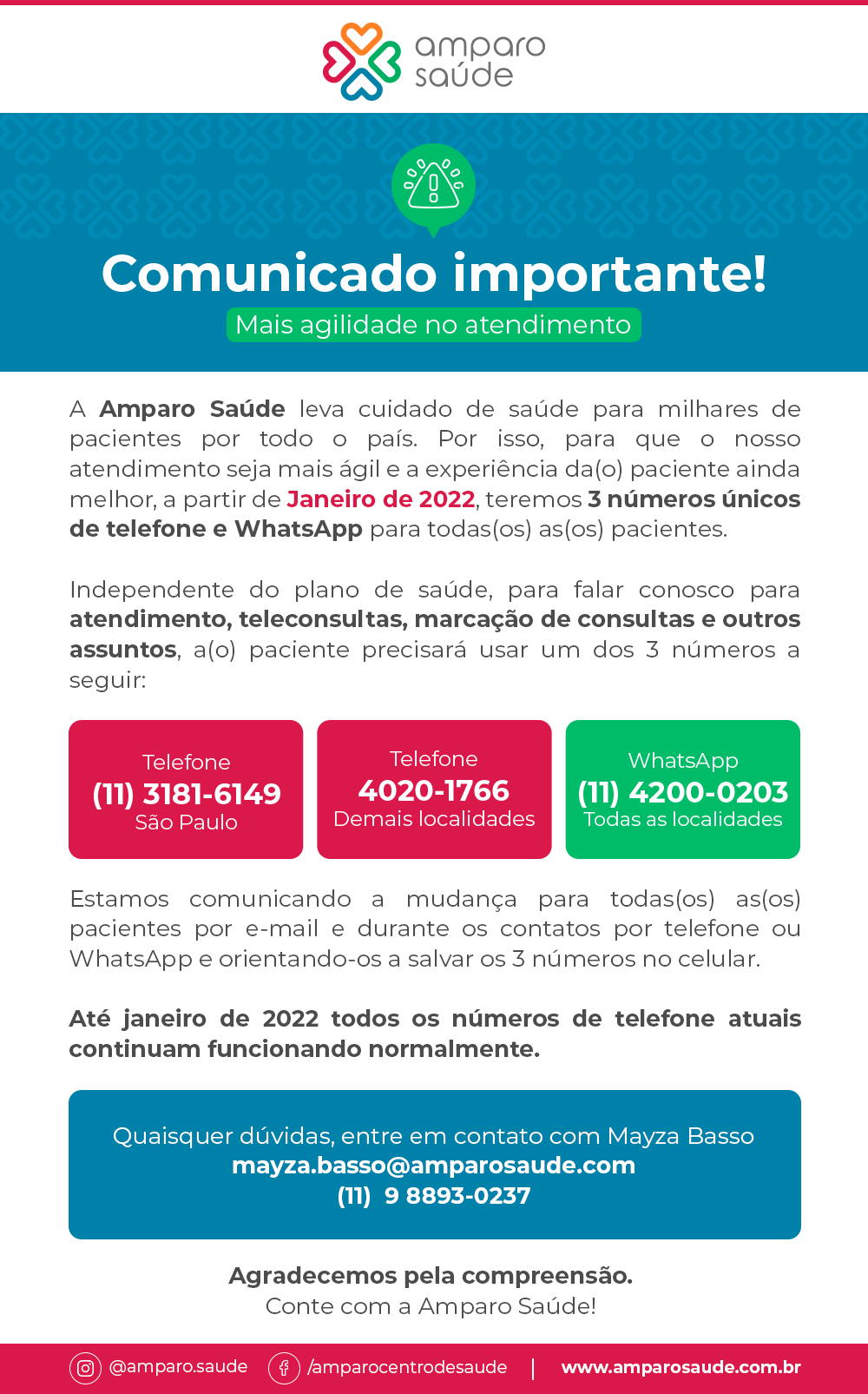 Atualmente, nas ligações realizadas pelo call center da Amparo Saúde aparecem vários números na tela do celular do beneficiário. A partir de janeiro de 2022, no entanto, esse problema não ocorrerá, tendo em vista que haverá apenas 2 números fixos. São eles: