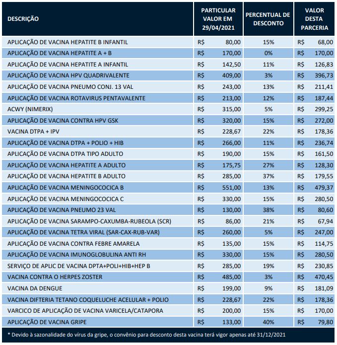 O pagamento da aplicação das vacinas será feito diretamente no laboratório. O convênio tem vigência até 2023. No entanto, devido à sazonalidade do vírus da gripe, a parceria para desconto desta vacina terá vigor apenas até 31/12/2021.