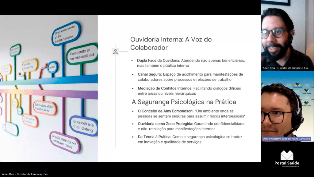 Na sexta-feira, dia 14/03, a Postal Saúde celebrou o Dia do Ouvidor, com uma palestra especial conduzida por Adan Reis, coordenador de Ouvidoria da Funpresp e especialista em gestão e mediação de conflitos. A atividade foi realizada via Teams e contou com a participação de colaboradores da Sede e das Regionais.