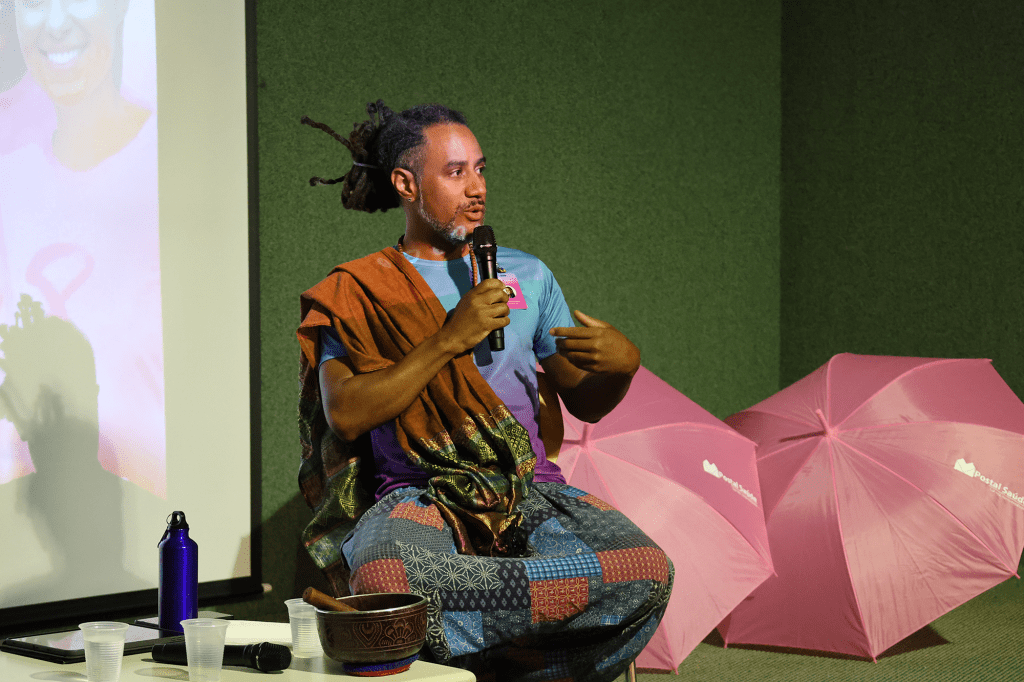 Para descontrair e relaxar, o professor de ioga e terapeuta da Saúde Clara, Fred, dirigiu uma aula muito agradável de automassagem, enfatizando que a prática de autocuidado tem que vir antes da doença.