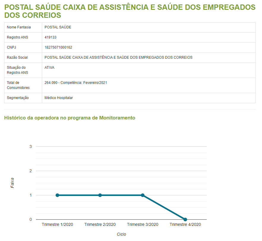 Pela primeira vez em sua história, a Postal Saúde foi classificada na Faixa Zero, a melhor na classificação do Monitoramento realizado sistematicamente pela ANS. Confira o gráfico publicado no site da agência reguladora: