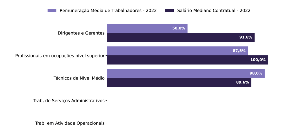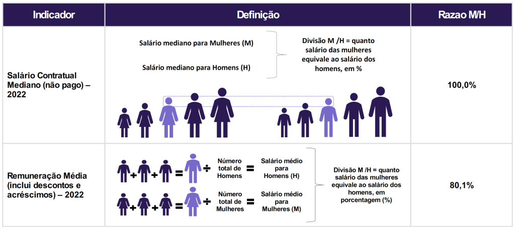Diferenças de salários entre mulheres e homens: O salário mediano das mulheres equivale a 100,0% do recebido pelos homens. Já o salário médio equivale a 80,1%.