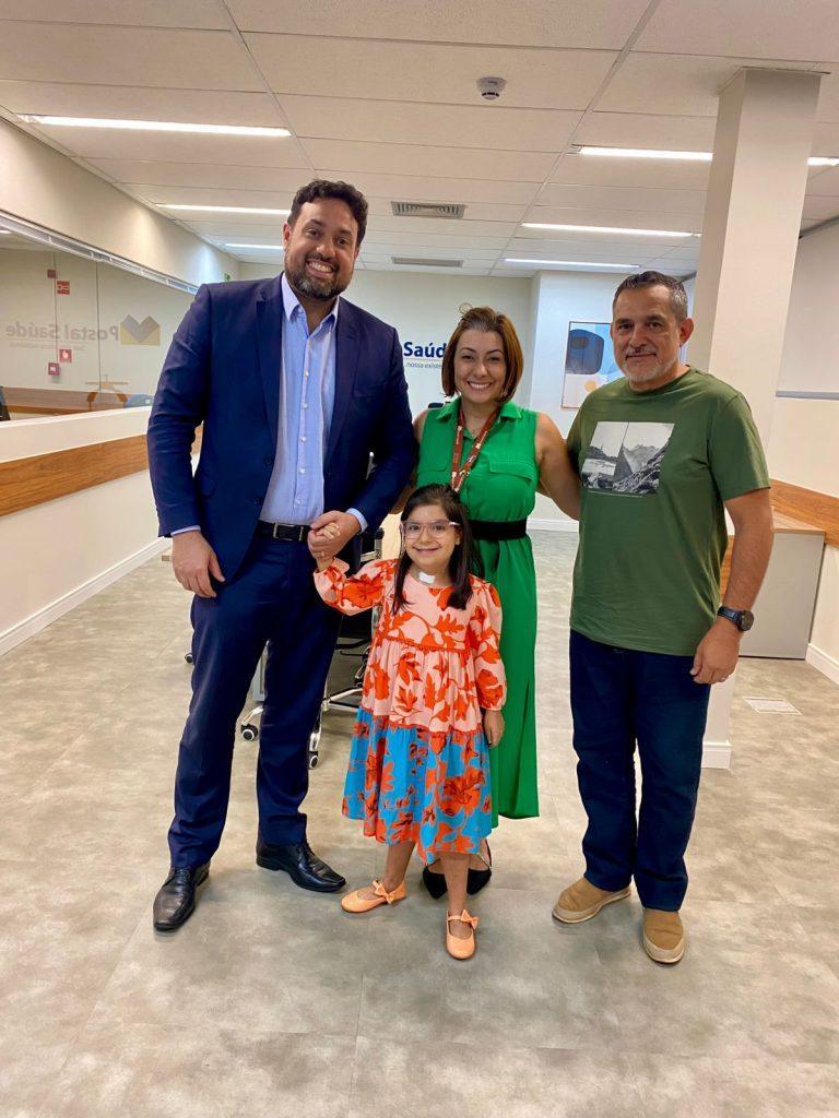 A Postal Saúde teve o prazer de receber em sua sede, em Brasília/DF, a visita especial da beneficiária Maitê Araújo, de 10 anos. A jovem esteve acompanhada de seus pais, André Araújo, que é funcionário dos Correios há 31 anos, e Gleyce Mara Araújo, colaboradora da Gerência de Operações de Saúde da Postal. Ricardo Léda, Diretor Administrativo e Financeiro, foi o responsável por recepcionar a família.