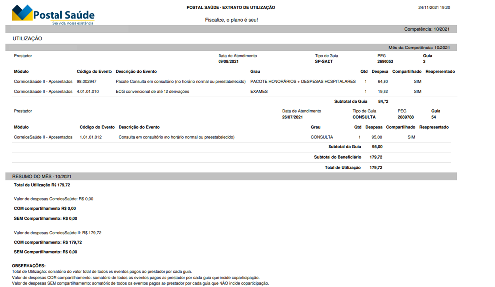 Extrato de Utilização traz o nome do prestador, a data e o tipo do atendimento (consulta, atendimento de emergência e urgência, internação etc.), o valor total da despesa e o valor pago pelo beneficiário.
